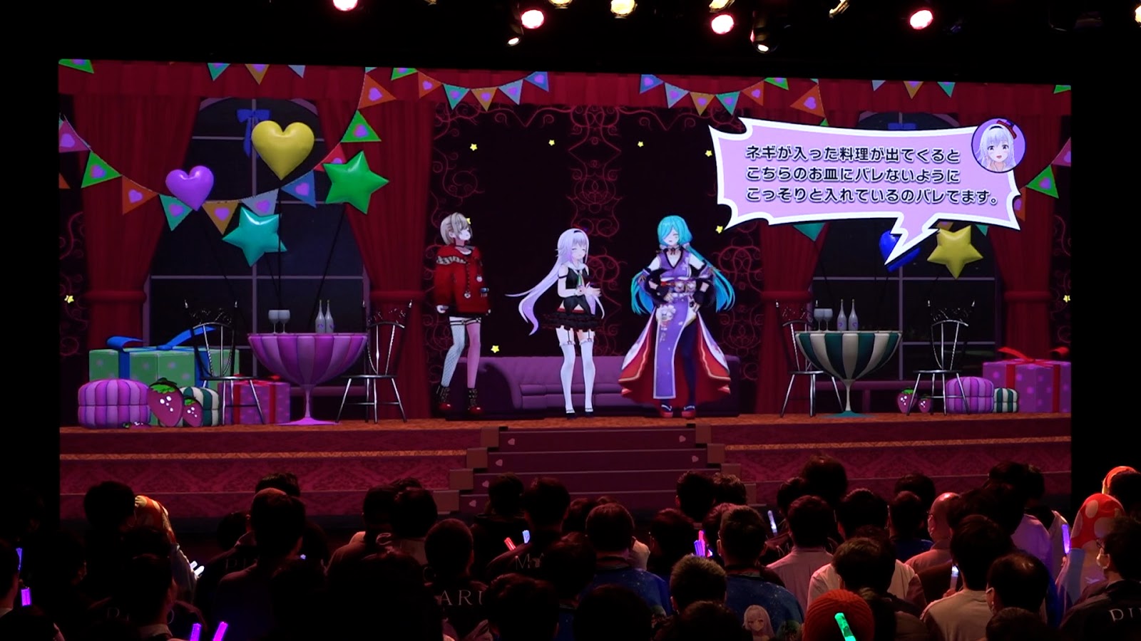 続く企画は “☆(推し)を探して”。魔法によって3人の内2人が同じ姿になり、どちらが本物かを観客が当てるという企画。先ほどの企画から一転、ファンの「メンバー理解度」が試されることに。「ソーラン節」「かっこいい決めポーズ」「ゴリラ」などポーズお題が出題され、戸惑いながらメンバーがポーズを取る場面も。ラストはレモン姿の神楽すずが殴り合いながら登場し、会場は大きな笑いと歓声に包まれた。