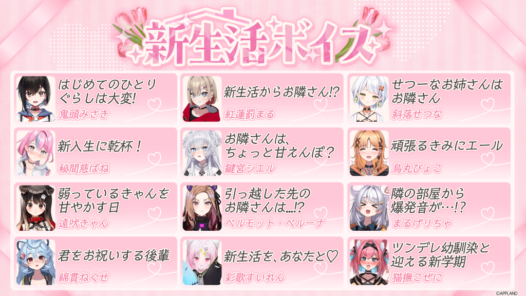 アップランド所属「.LIVE」・「ぶいぱい」メンバーによる『新生活ボイス』の販売を3月28日(金)より開始!各メンバーがそれぞれ「新生活」にまつわるテーマを持って登場!個性豊かなシチュエーションから生まれるメンバーとの特別なひとときを、ぜひお楽しみください!