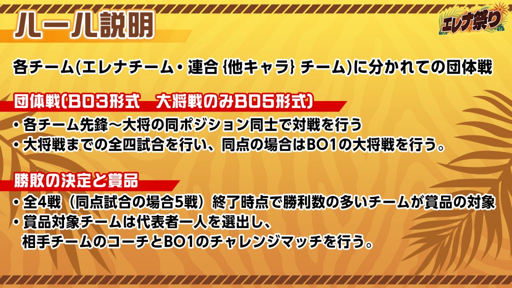 各チーム(エレナチーム・連合{他キャラ}チーム)に分かれての団体戦。