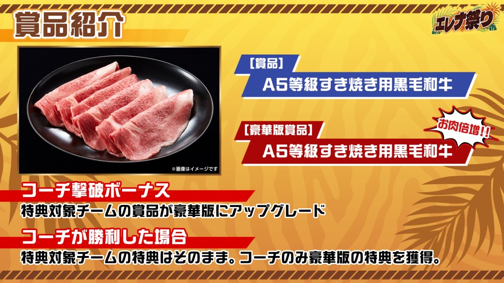勝利チームには「A5等級すき焼き用黒毛和牛」を贈呈させていただきます。