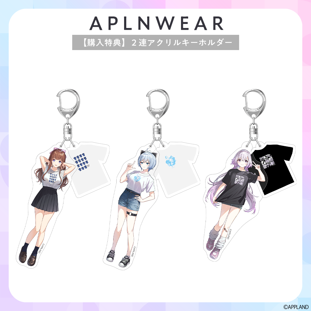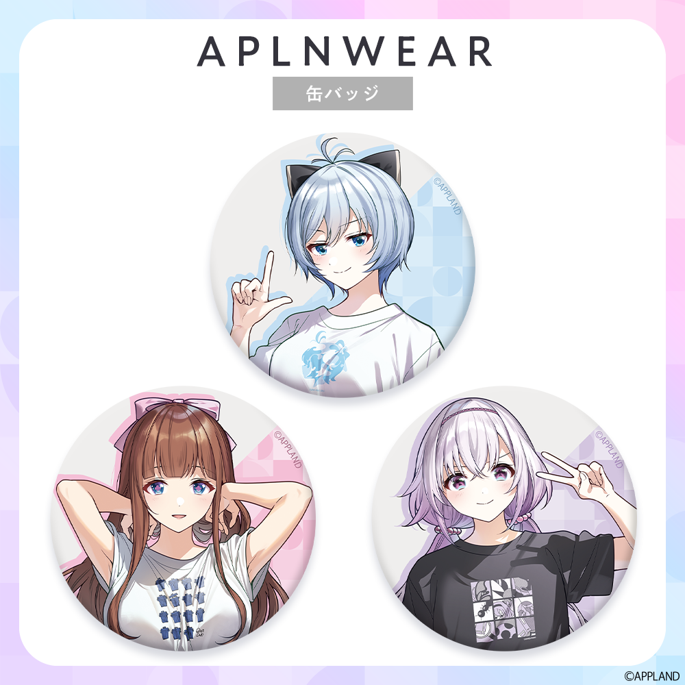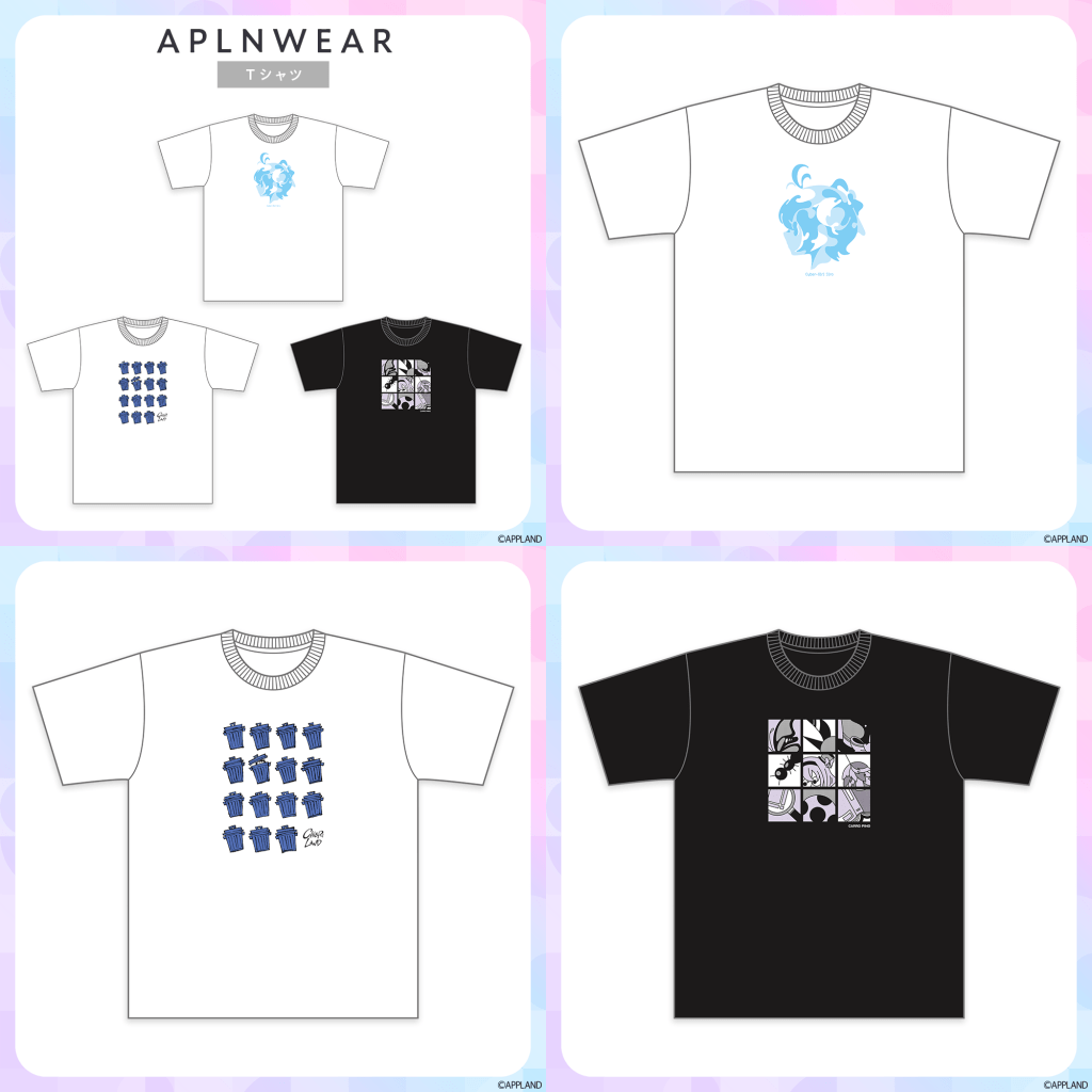 『アプランウェア』に関して、当社が運営する公式グッズ販売サイト(APPLAND OFFICIAL SHOP)にて2025年5月15日(木)より販売いたします!電脳少女シロ、花京院ちえり、カルロ・ピノの3名をイメージした、カジュアル性や着やすさ、着心地の良さを目指したTシャツとそれを着た3名のグッズが登場!夏に備えて、3人とのお揃いTシャツをぜひお楽しみください!