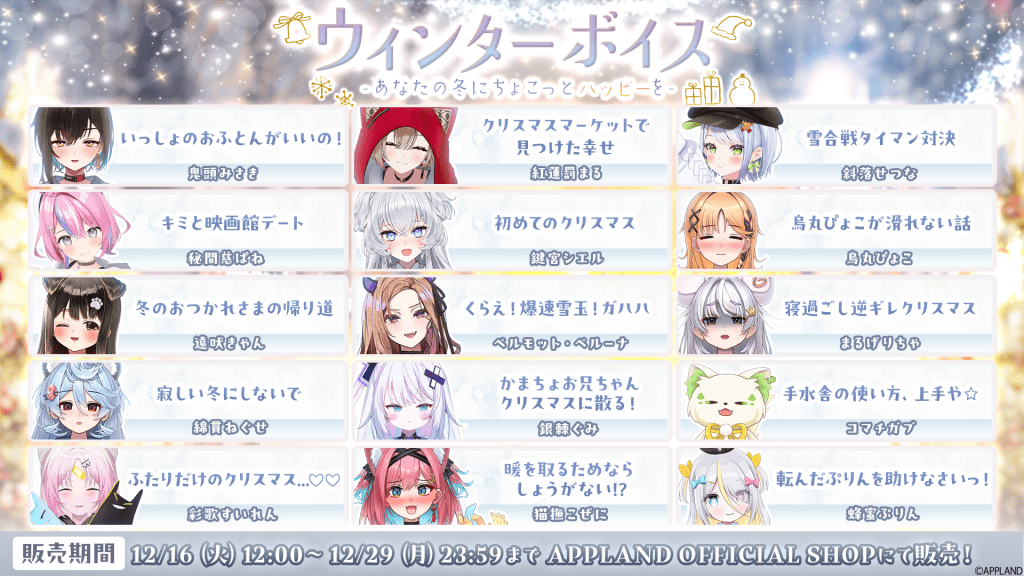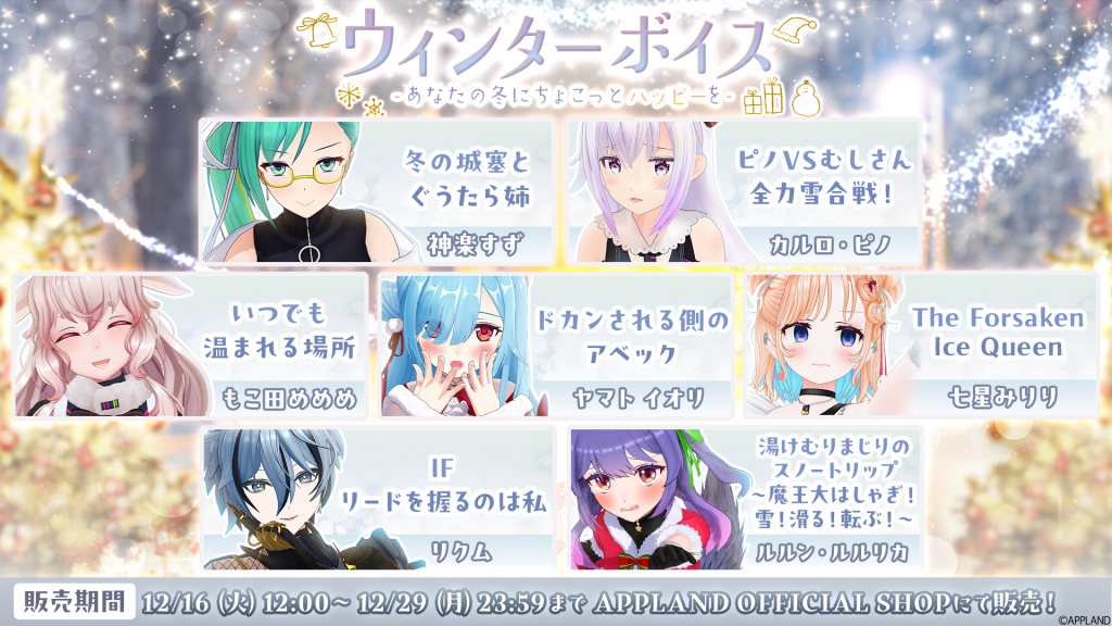 アップランド所属「.LIVE」・「ぶいぱい」メンバーによるボイスを2025年12月16日(火)より販売いたします!『寒さに負けそうな日も、声でほっとひと息♪あなたの日常に小さな笑顔をくれる、ぬくもり満載のひとときを━━』をテーマに、.LIVEメンバーとぶいぱいメンバーそれぞれが考案した、”あなたと過ごす冬”に関するシチュエーションが楽しめるボイスコンテンツです。是非お楽しみください!
