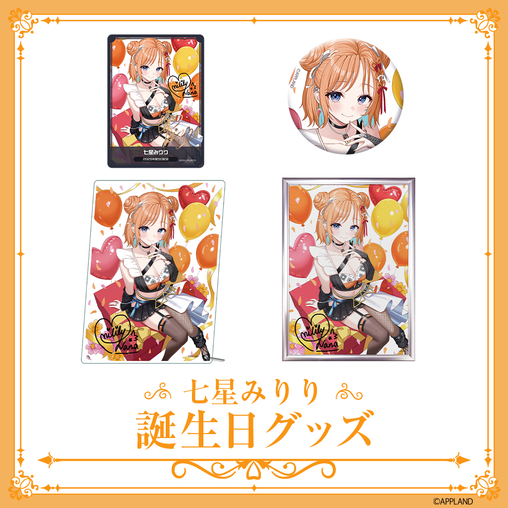 9月12日(金)に誕生日を迎える七星みりりの誕生日記念グッズ&ボイスを、当社が運営する公式グッズ販売サイト(APPLAND OFFICIAL SHOP)にて販売いたします!記念ボイスにはVRバージョンが用意されており、BOOTHで購入可能です。ここでしかゲットできない誕生日限定グッズ&ボイスをお楽しみください!