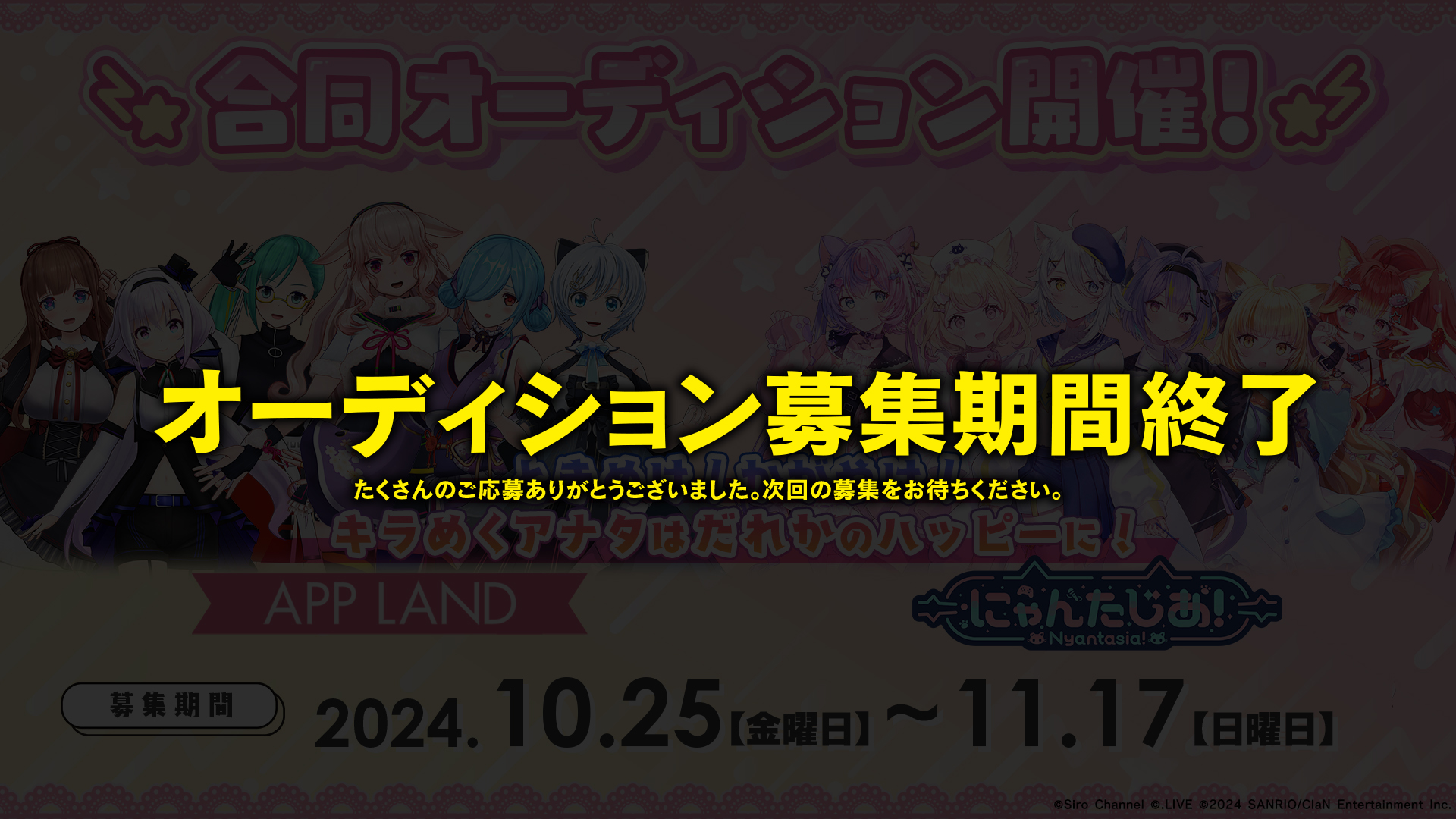 - 選考結果によっては、にゃんたじあ!プロジェクトではなく、サンリオ×ClaNが実施するほかプロジェクトへのご提案をさせていただく 場合がございます。